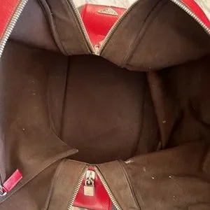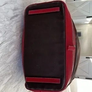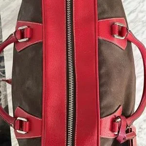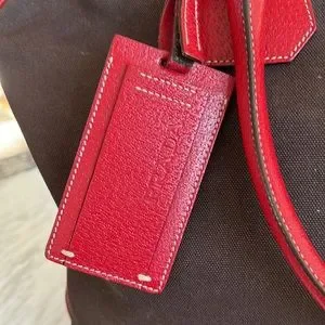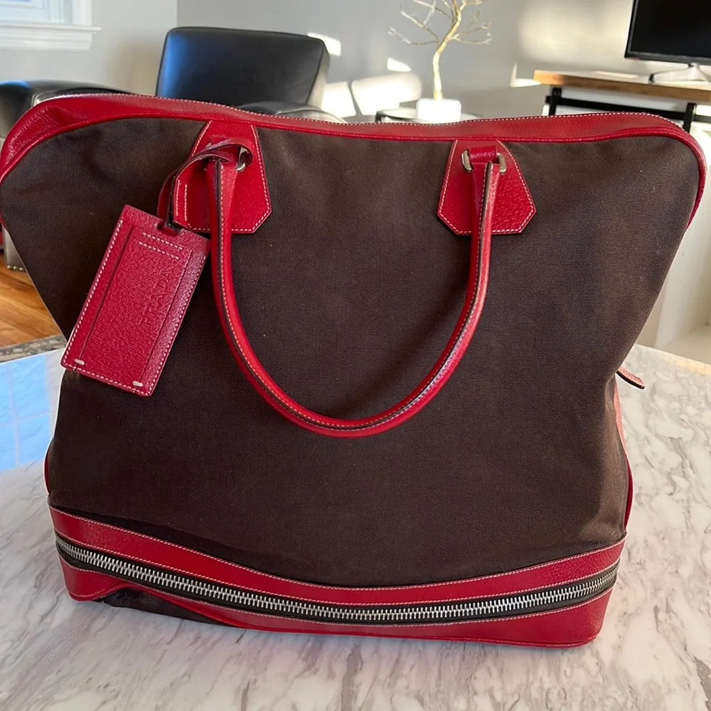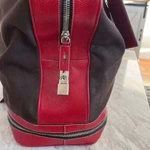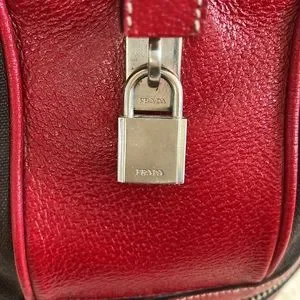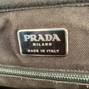 Prada canvas and leather travel bag with name tag and lock with key. This roomy bag is 15 inches in length, 15 inches height and 8 inches depth. Very spacious inside with zipper compartment and bag unzips at bottom for extra room that expands bag to 18 inches high. Bag is in great condition.
