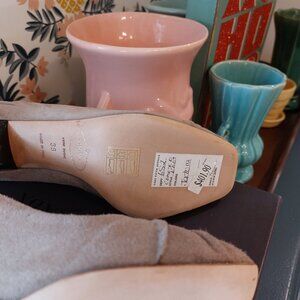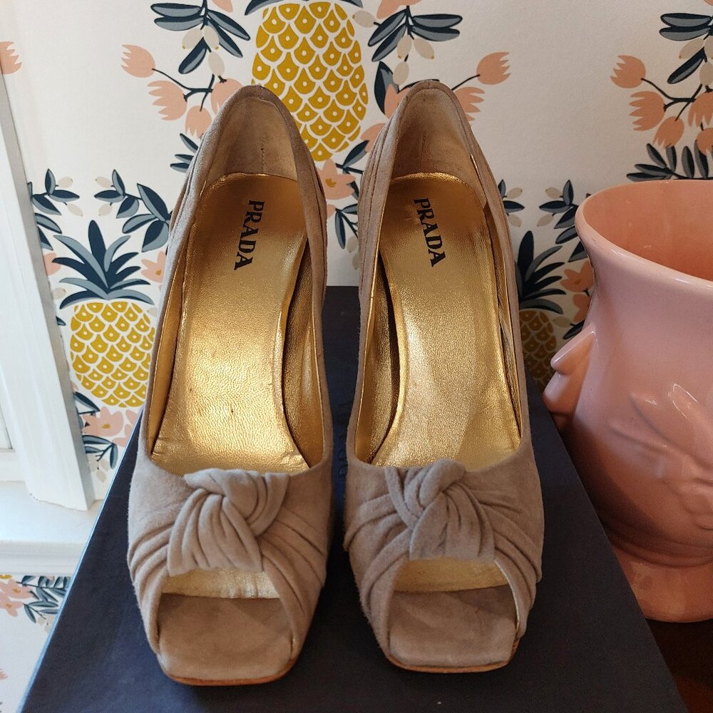 Prada taupe suade heels with lucite and metal heel. Excellent condition 3.5 heel height fits like size 8