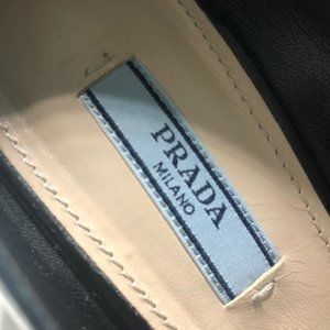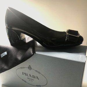 Treat yourself to these beautiful Pumps by PRADA! Perfect for the office, this pair of Pumps by Prada will accentuate your office attire with an elegant look. I loved wearing them with a classic pair of jeans and crisp white blouse. Crafted In patent leather, they feature impressive buckle details on the vamps and 2 1/4" block heels. The insoles are leather lined and carry brand labeling. This pair is accented with silver-tone hardware. The original box has a very small rip on one side otherwise it is intact. Two shoe sleeves with ties included. Slight scuffing on shoe(s) visible under very close observation. Both shoe soles have moderate scoffing however, a reputable shoe craftsman can restore/repair. Please look at the complete picture inventory prior to purchase. Free shipping. All of my items are lovingly cared for, cleaned prior to shipment, boxed if available and packaged securely. Items include a Thank you card for your purchase! (NOT ELIGIBLE FOR BUNDLE OFFER) Please note: BUY NOW! as I will be out of town from 10/18/25-10/22/25 and will not be available to ship this item until 10/23/25)