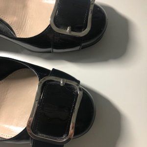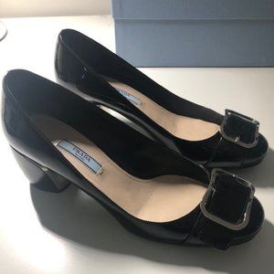 PRADA 8.5 BLACK PATENT LEATHER BUCKLE-BLOCK HEEL PUMPS!