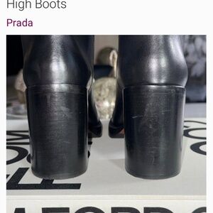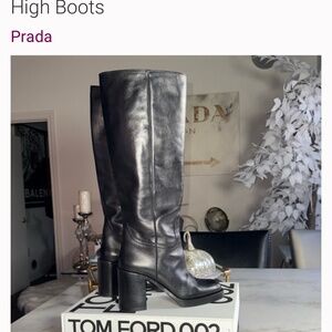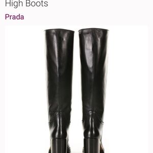 So good 🖤 Great condition with minor scratches & scuffs to the leather and wear to the bottoms - please see all photos for reference. No box, boots only. Size IT 39 - Made in Italy. Timelessly chic and masterfully crafted, these Prada 90mm leather knee-high boots are a sleek statement in Italian luxury. Designed in supple black leather with a square toe and structured block heel, they blend modern sophistication with all-day wearability. The pull-on silhouette makes them easy to style, whether you’re pairing them with a wool mini skirt and oversized knit or dressing up tailored pieces for fall. Complete with a durable rubber outsole and leather-lined interior, these boots reflect Prada’s signature craftsmanship and understated elegance. • Size: 39 (IT) • Heel height: 90mm (approx. 3.5 inches) • Pull-on style; square toe • Leather upper and lining; rubber sole • Made in Italy Disclaimer: PLEASE know your European shoe size, as most designer shoes run more narrow and typically a half to full size small. Please read online reviews before or do an in-store try-on before purchasing or ask me any and all questions! Style Aesthetic: Old money, elevated classic, luxury minimalism, modern equestrian, feminine, timeless chic, uptown polish, European street style, quiet luxury, cold weather essential, girl boss, cosmopolitan elegance, city chic, luxury