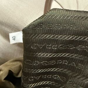 AMAZING CONDITION!! PRADA AUTHENTIC handbag featuring a drawstring closure and brown leather accents. The bag showcases the iconic Prada logo and is crafted with high-quality materials.