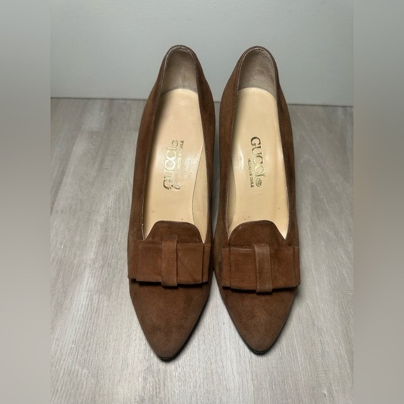 PRADA BROWN SUEDE BOW POINTED TOE MID HEEL CLASSIC PUMPS SZ 34