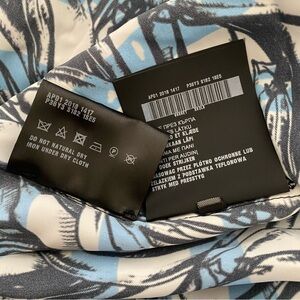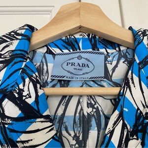 Prada twill dress in banana striped print. Notched collar; button front. Long sleeves. A-line silhouette. Midi length. Viscose. Made in Italy.