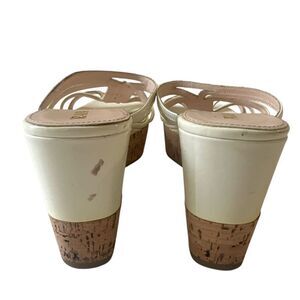 PRADA Beige Wedge Patent Leather Slide Strappy Sandals is in fair condition. Flawed with transfer in the left back heel please see all the photos. Made in Italy