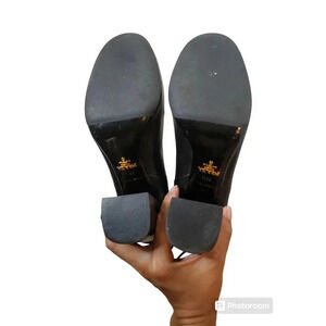 Round toe, tall block heel, ankle strap w/ large silver buckle.