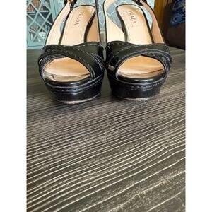 pre-loved, authentic, PRADA, black patent leather platform slingback peep toe pumps. NEAR MINT CONDITION