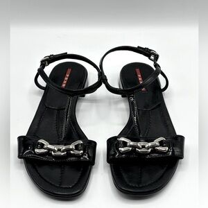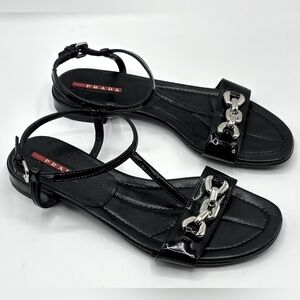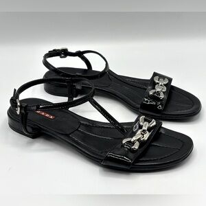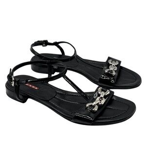 PRADA Black Patent Leather Sandals with Silver Block Chain Detail