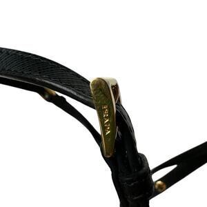 Black and gold saffiano leather wallet strap from Prada. There's minor wear to the bucks and some twisting from being in storage as shown.