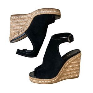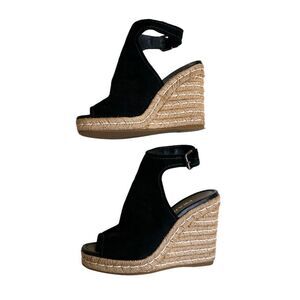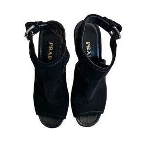 PRADA Black Suede Espadrille Wedge Sandals is gentle worn. Made in Italy. Platform heels buckle at the ankle.