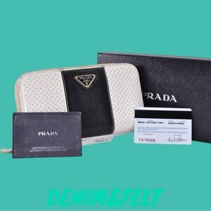 🖤PRADA Black/White Two Tone Perforated Logo Plate Leather Long Around Wallet!🖤