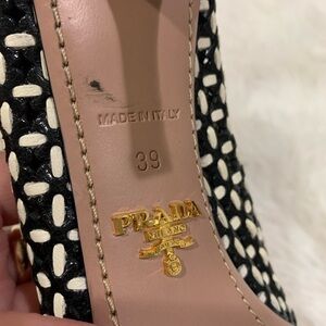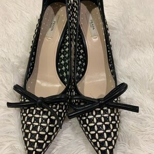 A one-of-a-kind Prada woven leather pumps - Very rare Size: IT 39, fit a US size 8.5 - 3” covered heel Stunning woven leather upper - Pointy toe - Bow accents on top - Condition: excellent pre-owned - Really really gorgeous! ❤️