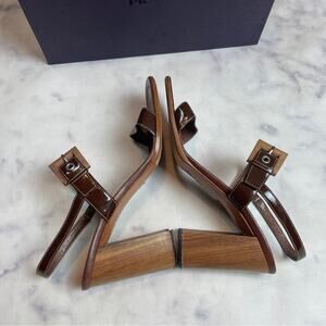 vintage brown patent leather open toe sandals with wood grain block heel and coordinating wood buckle from PRADA. leather upper, lining and sole. approx 3.75” wood grain heel. made in Italy. includes original shoe box and shoe storage bags. GUG to VGUC - a few light scuffs on upper and faint surface scratches on wood heel - see all photos.