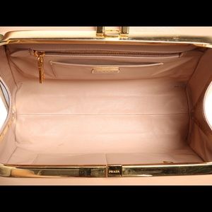 Made of Saffiano patent leather, Prada’s Cammeo Pyramid Bag has a gold frame with a logo plaque on the front – nice! Coming with a box, dustbag, and cards, there is wear on the hardware, inside, and light wear on the corners, as well as marks on the leather, a watermark on the back, stains inside, and some weight to it. The clasp on the frame is hinged and opens to the matching leather lining with three slide pockets and two zipped pockets inside.
