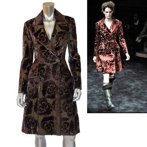 Unique Features: This stunning Prada coat, featured on the runway, in major editorials, and an advertising campaign, is a true collector’s piece. Crafted from luxurious burnt jacquard velvet, it boasts a flattering double-breasted silhouette with a cinched waist that exudes elegance and edge. A bold, standout style—perfect for anyone looking to own a piece of Prada’s fashion legacy.