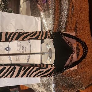 NWOT Prada Beauty pink and black cosmetic pouch w Prada Beauty pink charm, unbranded pink and black zebra print guitar strap, unbranded black plastic chain, unbranded dark metal bag extender, and unbranded silver bag extender. Pouch measure 8 in. x 5.5 in. Gorgeous!