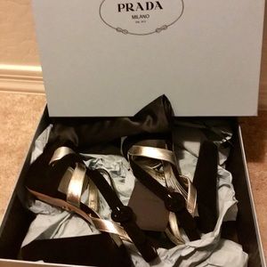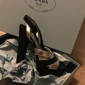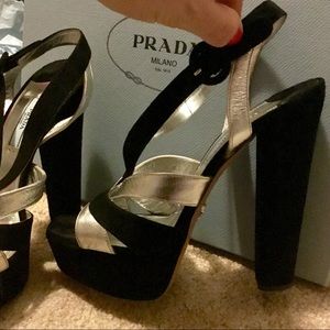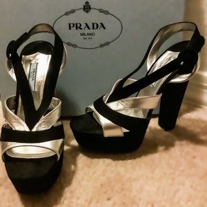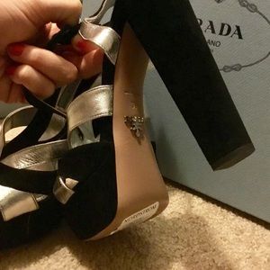 PRADA- black & silver (metallic) platform sandals. New, never worn. Incredibly rare style, sold out everywhere! Purchase includes Prada shoe box, both Prada shoe dust bags, and the Prada certificate card of authenticity. Calzature Donna. Art/Style #1XP810. Camoscio & Silk. Size 39 Purchased via special order at Nordstrom. These are absolutely STUNNING & photos simply don't do justice. My loss is your gain. Posh rules only, no trades. Thank You & Happy Poshing!!⚜️