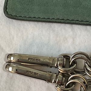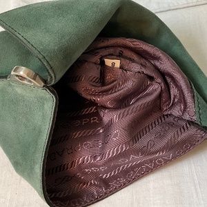 Excellent pre-loved condition! Super cute and adorable, vintage Prada camoscio soft and supple suede Metal Sound flat flap bag with silver metal push lock closure and detachable silver metal double-ring link chain. A very rare find in this particular style and color! Color is a chapelle/agave green- like a silvery jade green with a hint of aqua. Depending on the lighting angle, it sometimes looks like a darker green, and sometimes it looks more silvery bluish green. Hard to capture correct color due to nap of suede but it is definitely a green bag- best seen in photos with interior Prada plaque and the number tag. Please realize that colors may vary with your monitor. One small dot blemish to silver metal closure (see photo). Exterior suede is in great condition. A few faint marks, and slight darkening of the suede along the top where it folds over. I did not try to clean the suede for fear of leaving water marks. Interior is clean with no detectable issues. Please note that it is one open compartment with no pockets or pouches. Approximate size is 7.5” wide, 5” tall, and strap drop 8”. As this is a flat, envelope style bag, it is only a few millimeters in depth at best (see photo). Measurements and hallmarks photos. Comes with Prada dustbag as pictured.