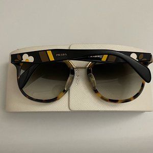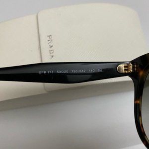 Description: Tortoise Frames that features Prada logo and floral accents on the sides of the temples. These frames come with Gray Gradient Lenses.
