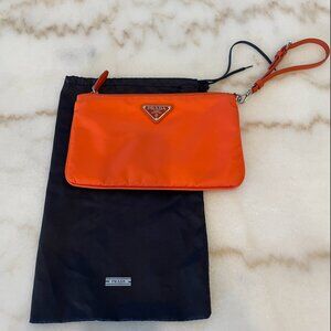 Presented in an bright orange hue, this PRADA clutch bag is crafted from Nylon. The signature enamelled metal triangle logo on the front finishes off the design. Including original storage pouch.