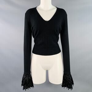 PRADA pullover comes in a cream knitted material featuring a eyelet ribbon trim and a v-neck. Made in Italy.