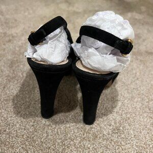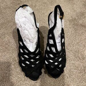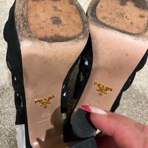 - PRADA Cut Out Black Suede Open Toe Cage Heels