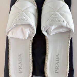 PRADA updates the stylish espadrille slide with signature diamond-quilted straps for an elegant addition to your summer footwear edit. Made from soft lambskin leather, they have classically woven soles and tonal logo detailing.