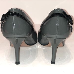 A dark grey patent leather heel featuring black patent leather straps across the front toe and back heel