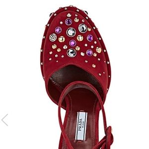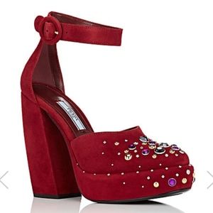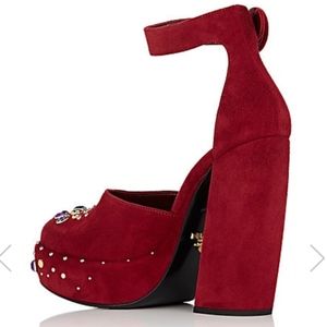Prada's sandals are crafted of burgundy ultra-soft suede. Designed with a comfortable platform and angled chunky heel, this ankle-strap style features mixed jewel and stud embellishments.