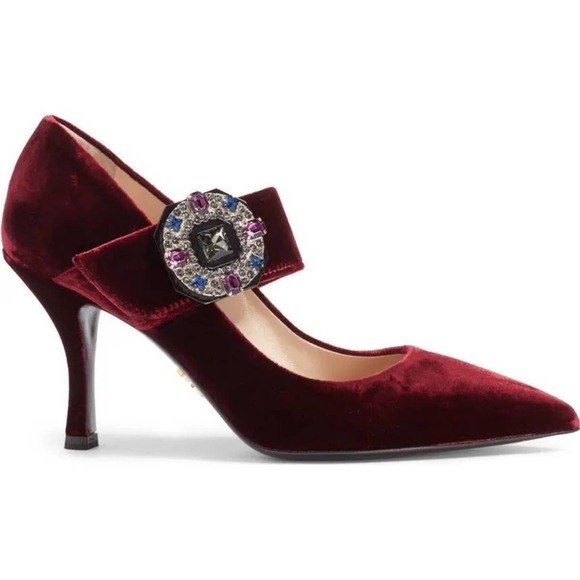 PRADA Embellished Velvet Mary Jane Pointy Toe Art Deco Bordeaux EU 39.5 $990
