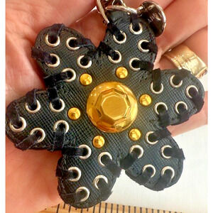 PRADA Flower BAG CHARM Key Ring Holder BLACK Leather Gold Silver METAL RARE AUTH