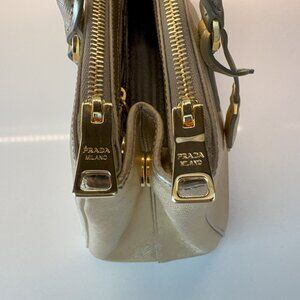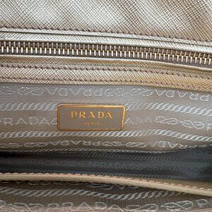 Hardware: Gold-tone hardware accents, including the iconic Prada logo plaque on the front