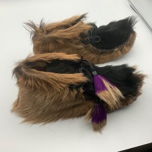 Tan and black goatskin ankle boot. Leather footbed. Rubber soles.Dust bags. In box