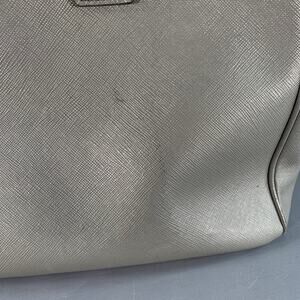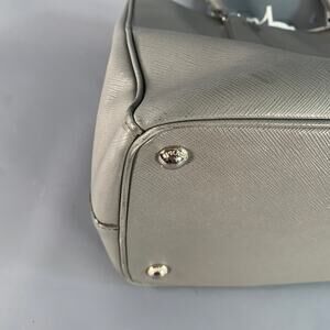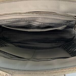 PRADA "Galleria" handbag in a grey saffiano leather featuring three roomy compartments, rolled top handles, and removable crossbody strap. Comes with dust bag.Good Pre-Owned Condition. Moderate signs of wear, please check photos. As is.Measurements:Length: 13.25 in.Width: 5.75 in.Height: 9.25 in.Drop: 5 in.