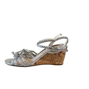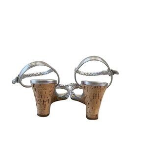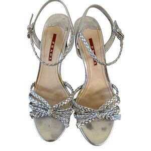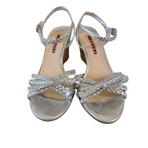 PRADA Heels Womens Silver Metallic Leather Strappy Open Toe Wedge Sandal Size 8