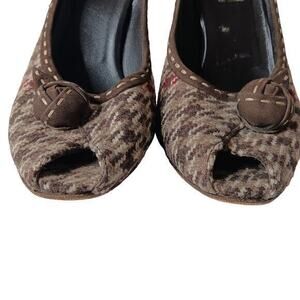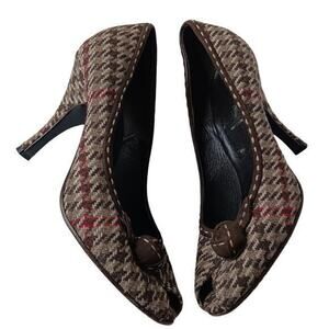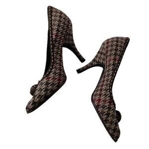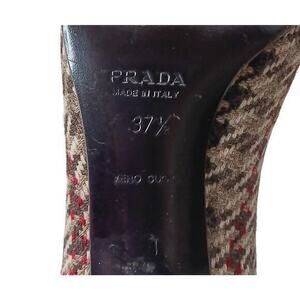 PRADA Houndstooth Fabric Heels Pumps Shoes Size 37.5 Peep Toe Brown Red Wool