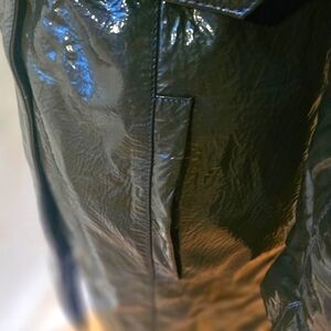 This rare Prada women's olive green genuine patent leather coat is a luxurious and stylish addition to any wardrobe. Made in Italy, this trench coat features a classic neckline, button and belt closure, and long sleeves. The long length and belted fit make it versatile for all seasons and occasions, from casual outings to formal events. The elegant design and high-quality materials ensure both comfort and sophistication, perfect for the modern woman looking for a designer piece with a touch of Italian flair.