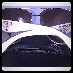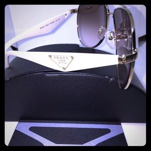 AMAZING NEW PRADA LARGE AVIATOR SUNGLASSES! MODERN CLASSIC MUST HAVE! METAL FRAME W/BEIGE PLASTIC TEMPLES W/PRADAS CLASSIC TRIANGLE LOGO ON THE SIDE! THIS LOOK IS SO SOPHISTICATEDLY IN UR FACE CHÍC! I ❤️ THE WAY THIS COLOR LOOKS ON BLONDES! IT BLENDS W/YOUR COLORING &THEY MAKE A GREAT EVERYDAY PAIR, EVEN JUST RESTING ON UR HEAD! IF UR BRUNETTE, LIKE MYSELF, I 💙HOW U CAN MAKE THEM MATCH OUTFIT SPECIFIC! NOT ONLY WILL THEY LOOK GREAT ON&ON UR HEAD,BUT THEY WILL LOOK FAB W/UR CARGOS & OLIVE DRABS!