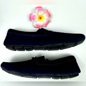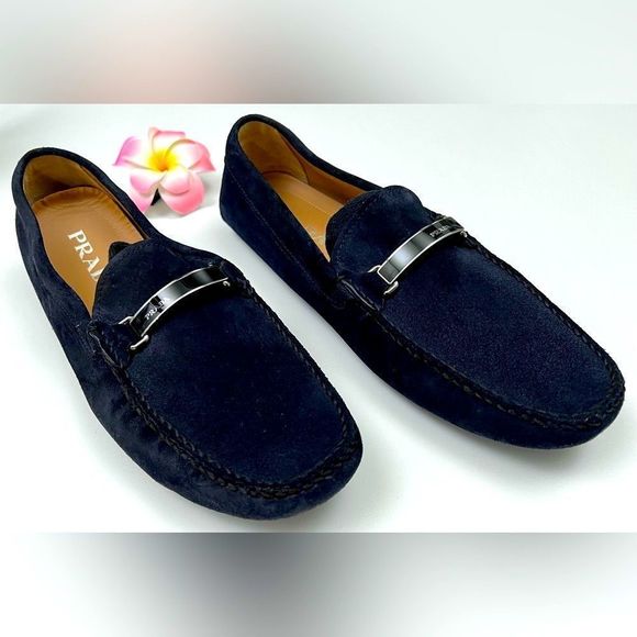 Let comfort and classic style be yours with these designer loafers from Prada. Crafted in navy blue suede, the high-quality shoes have the perfect construction to take you through the day with utmost ease.