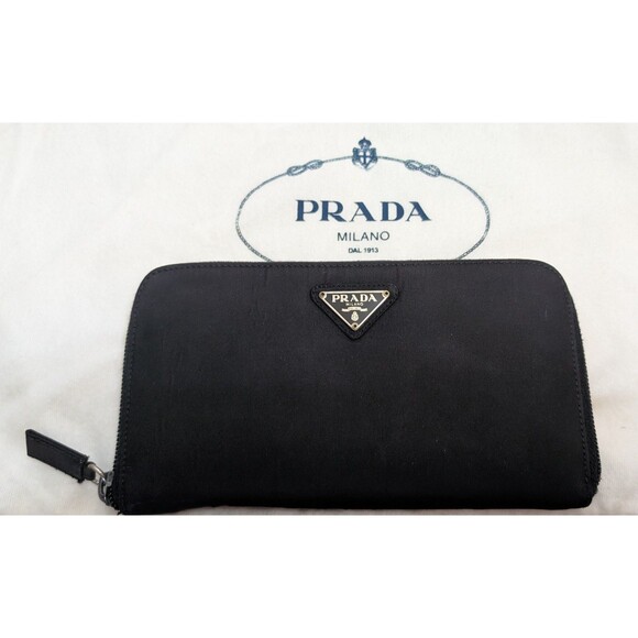 PRADA Logo Plate Nylon Zip Around Long Wallet Black Credit Card
