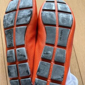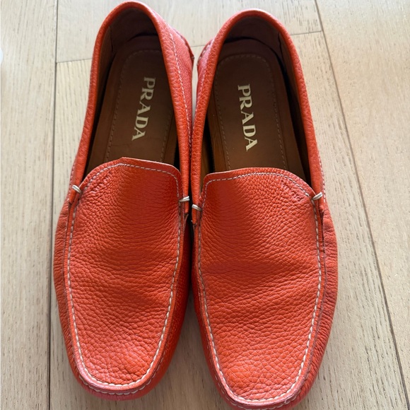 Prada loafers size 8 men shoes. Calf skin leather very soft. Good condition. The color is orange but more like burn orange. Very comfortable and look great with any outfit