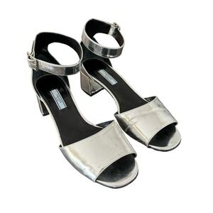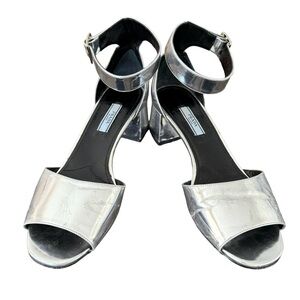 PRADA Metallic Silver Leather Sandal Block Heel Ankle Strap Women’s Size 39