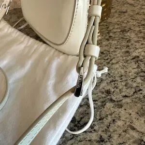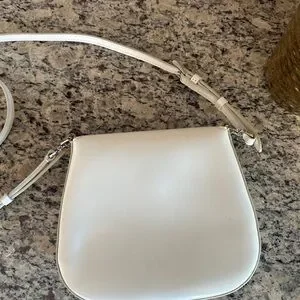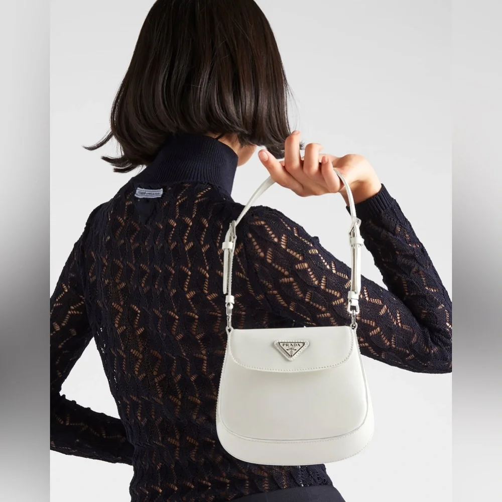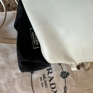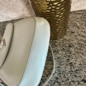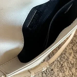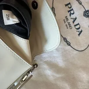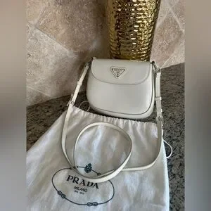 Compact Prada crossbody in smooth cream leather. Flap front with signature triangular silver-tone logo. Adjustable shoulder strap for versatile wear. Minimal, elegant silhouette for day or night.