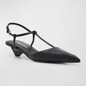 The label's iconic triangular logo serves as the architectural kitten heel of this smooth leather cagey T-strap ballerina pump sharpened by a pointy toe for further geometric edge. 1" (35mm) heel Adjustable strap with buckle closure. Leather upper and lining/rubber sole. Made in Italy.