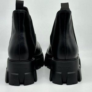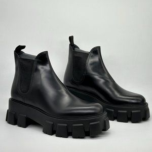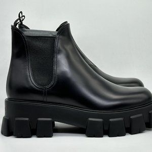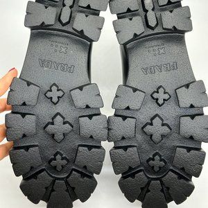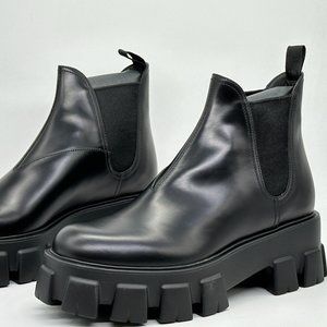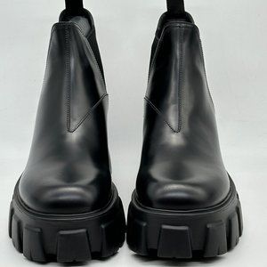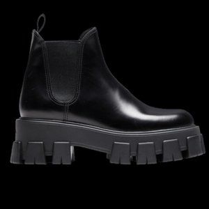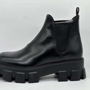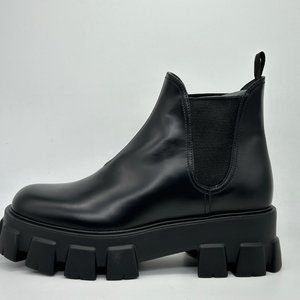 PRADA Monolith Brushed Leather Lug Sole Chelsea Pull On Ankle Boots Black