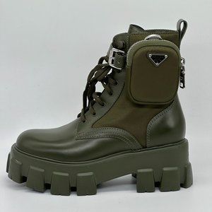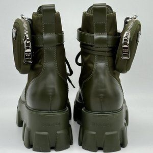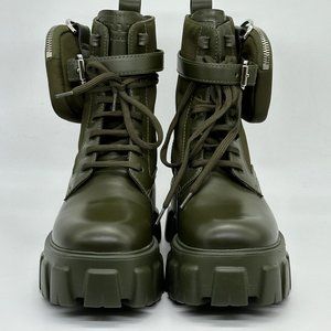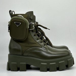 PRADA Monolith Leather Nylon Lug Sole Combat Hiking Boots Zip Pouch