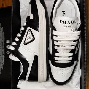 PRADA NEW BLACK AND WHITE WOMENS LOGO SNEAKERS