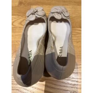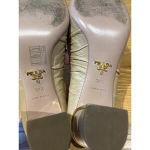 The PRADA Nude Leather Gold Trim Chunky Heel Pump with Flower Embellishment in size 38 1/2 features a solid beige color with a slip-on closure and leather lining. The pump style heel has a medium height and a chunky heel design, adorned with a flower pattern and logo accents. Made in Italy by the designer brand PRADA, this stylish shoe is perfect for adding a touch of luxury to your outfit, ideal for summer, fall, and spring seasons. Perfect for the fashion-forward woman who values both style and quality in her footwear collection.