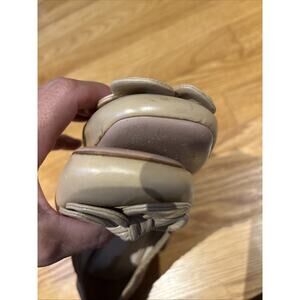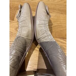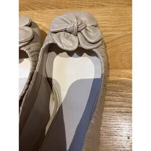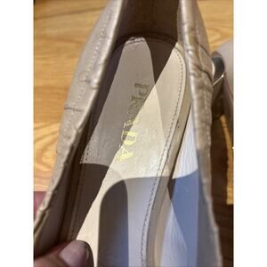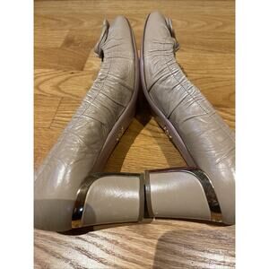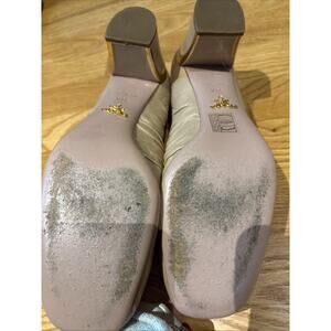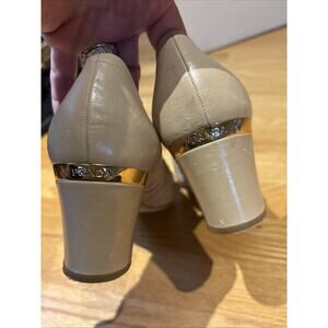 PRADA Nude tan Leather Gold Trim Chunky Heel Pump Flower Embellishment 38 1/2 8