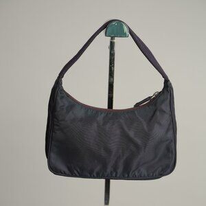 Stylish classic, this Vintage Prada Tessuto Nylon Pochette is dark purple and features durable nylon construction, a nylon zipper pull, and silver hardware. Adorned with the iconic black and silver Prada triangle logo, this compact bag is perfect for everyday use. Easy to clean and maintain, it shows minor discoloration due to age.
